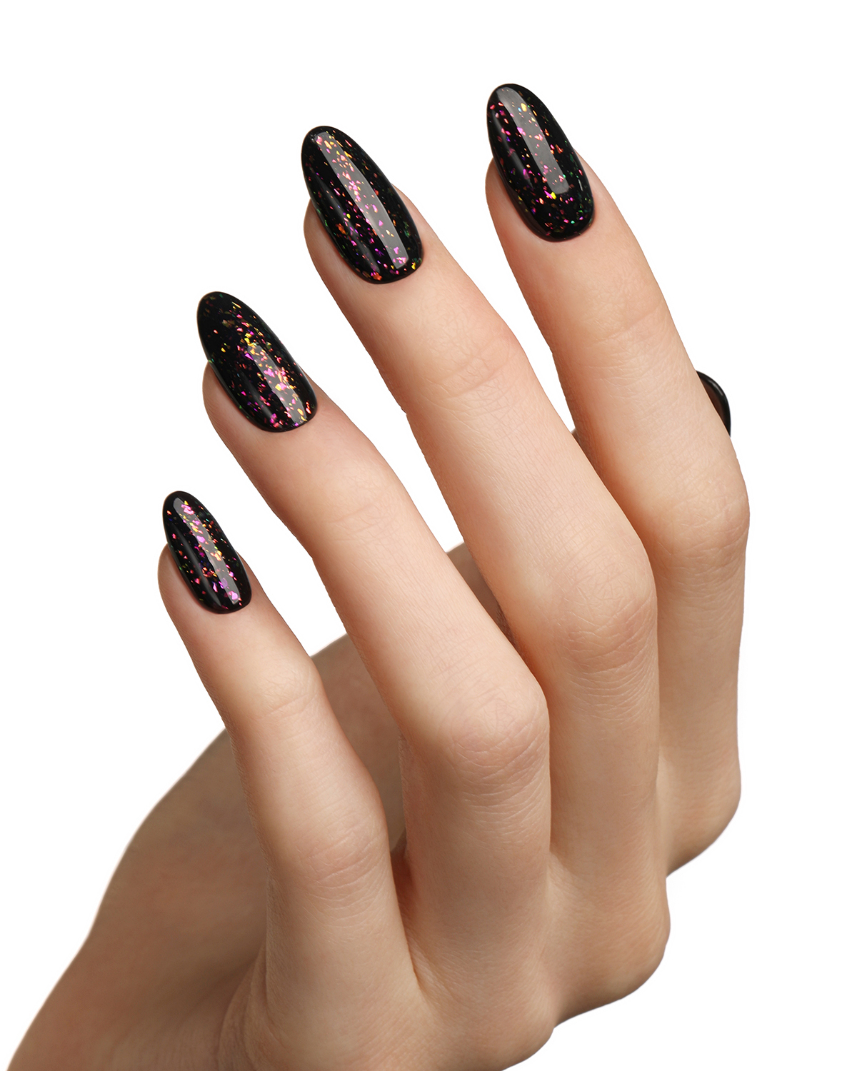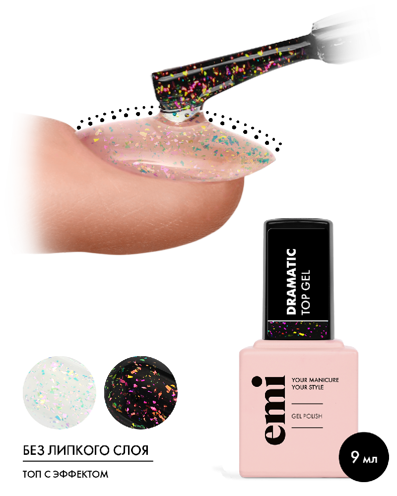 Глянцевое финишное покрытие с мелкими хлопьями цветной потали. В зависимости от цвета подложки, поталь переливается разными градиентами, становится ярче или светлее, придавая маникюру, то легкий игривый эффект, то создавая дерзкий вечерний дизайн маникюра. Не имеет липкого слоя. • Головокружительный эффект дискошара: частицы потали под разным углом освещения переливаются разными цветами. • Стильный образ: на светлых оттенках смотрится легко и игриво, на темных ярко переливается, создавая дерзкий градиентный блеск. • Универсальное покрытие: подходит под гель-лаковую и классическую системы. • Удобная консистенция: топовое покрытие средней степени вязкости отлично самовыравнивается и не растекается. Мелкие частички потали легко распределяются по поверхности, не торчат.