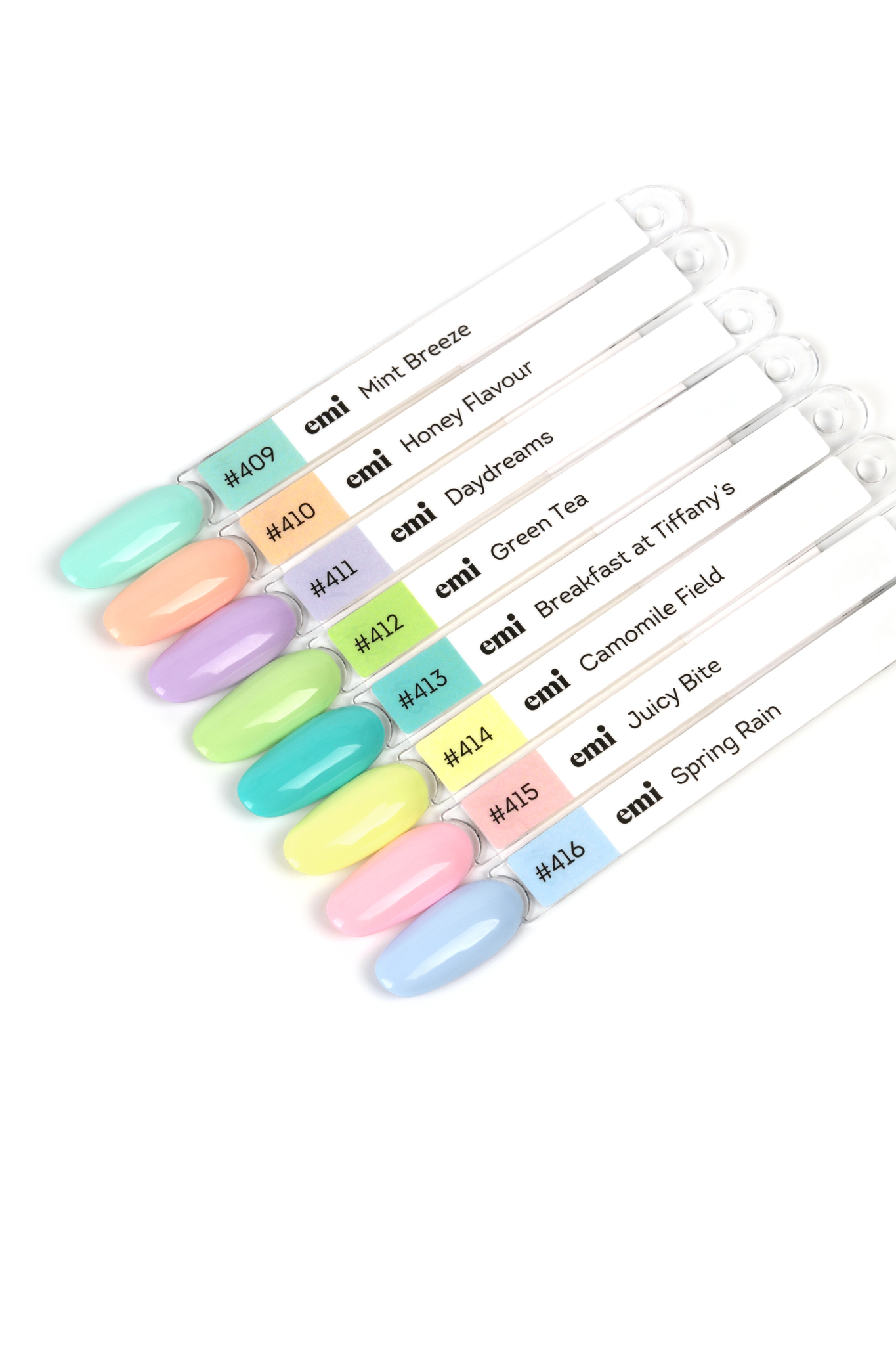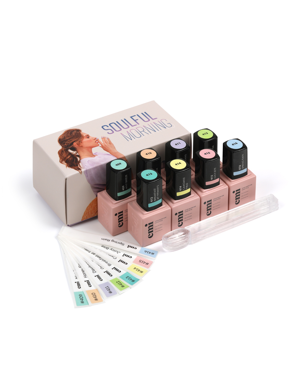 • Коллекция Soulful Morning – нежная, пастельная, легкая. Палитра состоит из восьми освежающих оттенков, которые отражают ощущение свободы и легкости в весенне-летнем воздухе. • От нежно-фиолетового до цвета «Тиффани»: плотные оттенки идеально подходят для создания не только актуального однотонного маникюра, но и дизайнов в стиле градиент. • Комплект ложек с наклейками. В комплект входят наклейки с ложками для подготовки демонстрации оттенков клиентам. • Удобный формат для знакомства со всеми оттенками из коллекции. В набор входят: 1. E.MiLac SM Мятный бриз №409, 9 мл 2. E.MiLac SM Запах меда №410, 9 мл 3. E.MiLac SM Мечтания №411, 9 мл 4. E.MiLac SM Зеленый чай №412, 9 мл 5. E.MiLac SM Завтрак у Тиффани №413, 9 мл 6. E.MiLac SM Ромашковое поле №414, 9 мл 7. E.MiLac SM Лакомый кусочек №415, 9 мл 8. E.MiLac SM Весенний дождь №416, 9 мл 9. Наклейки на ложки Soulful Morning №409-416 10. Ложки