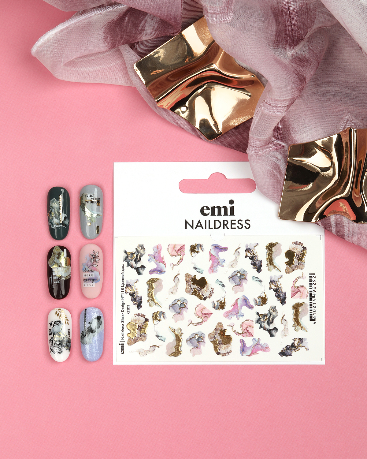 Naildress Slider Design №118 Цветной дым- тематические фигурные слайдер-дизайны. • Фольгированные элементы и акварельные разводы – два топовых тренда в одном принте. • Одновременно нежные и эффектные дизайны - металлизированные мазки и лаконичные линии, у которых отсутствуют любые грани. • За счет фольги создается стильный 3d-эффект. Если дополнительно покрыть золотые элементы Gemty Gel, дизайн будет выглядеть еще объемнее и эффектнее. • Идеальный вариант для тех, кто предпочитает нежные, женственные дизайны, абстрактные принты, для тех, кто любит акцентные дизайны.