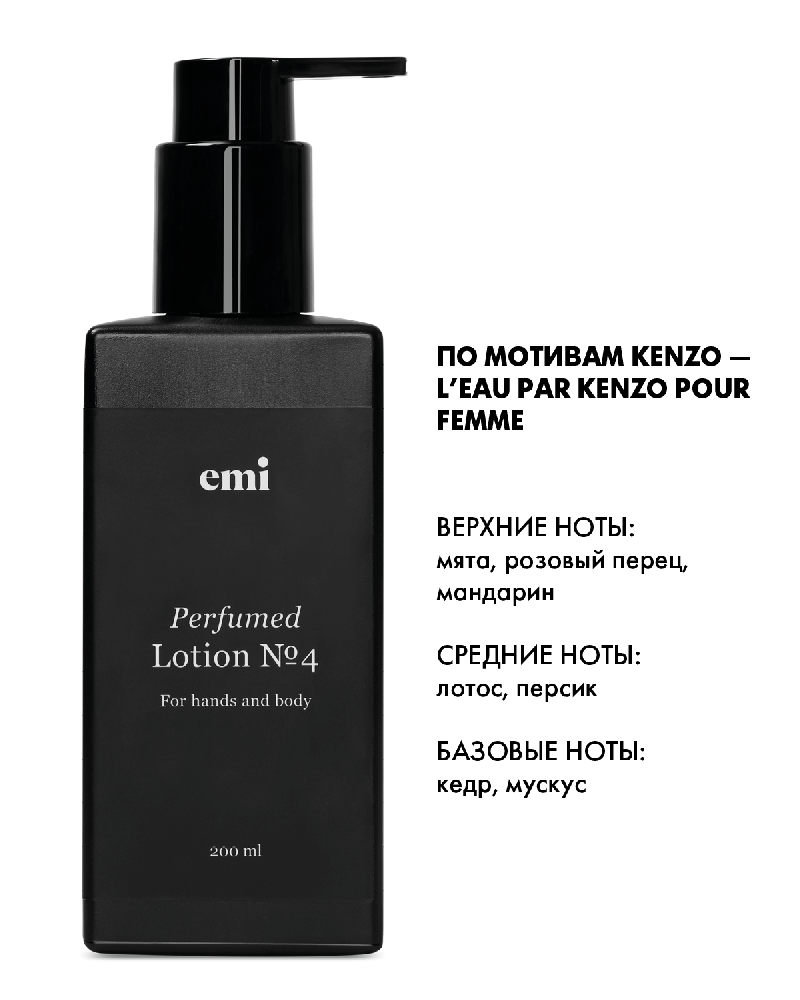 Вдохновленные стилем жизни современных женщин, мы создали Perfumed Lotion, чтобы выразить восхищение твоей многогранностью, активностью, легкостью и любовью к себе. Perfumed Lotion – это легкий лосьон, с мягкой текстурой, которая впитывается за считанные секунды, не создавая ощущения липкости, тяжести и пленки на коже. Разные, идеально сбалансированные отдушки созданы по мотивам знаменитых парфюмов. Подобно дорогому парфюму, верхние ноты ароматов сплетаются с пикантными нижними нотками создавая многогранные и очаровывающие переплетения. Аромат №4 – Твоя внутренняя энергия безгранична и ощутима. Полупрозрачный утонченный аромат дышит свежестью мяты и цветочными композициями. Наносишь, и в первые секунды чувствуешь холодок мяты, мандарин, мягкий розовый перец. Стойкой нитью тянутся кедр и мускус, а волшебства аромату придают лотос и сочный персик. Активные компоненты: • Масло семян конопли • Пантенол • Экстракт листьев зеленого чая • Экстракт пшеницы • Экстракт Фукуса пузырчатого Чаще всего аромат начинает раскрываться через 15-20 минут после нанесения. Стойкость аромата сохраняется до 10 часов.