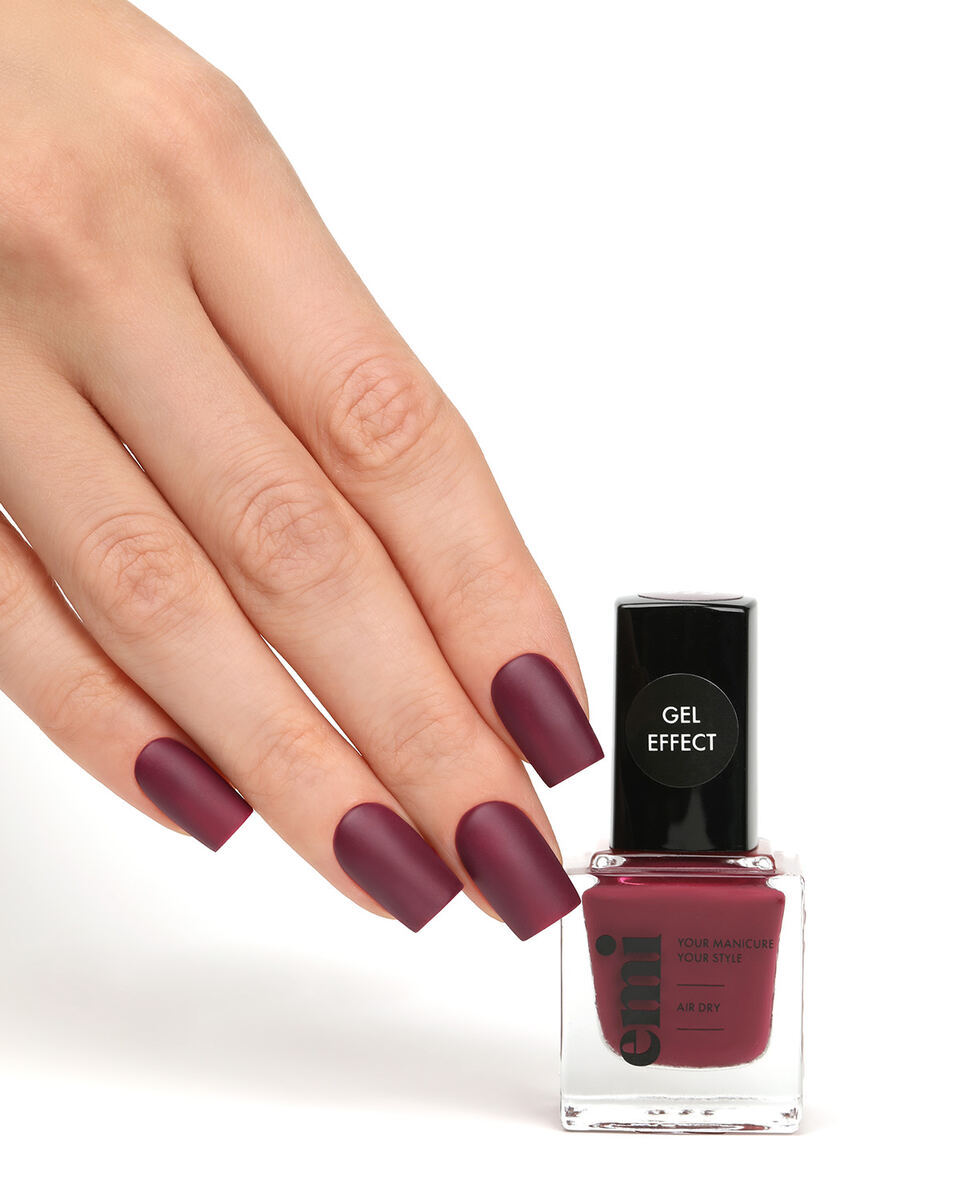 Ультрастойкий лак Gel Effect Багровые реки №222 бренда E.Mi – насыщенный бордовый оттенок с матовым эффектом, таящий в себе глубину и загадочность.